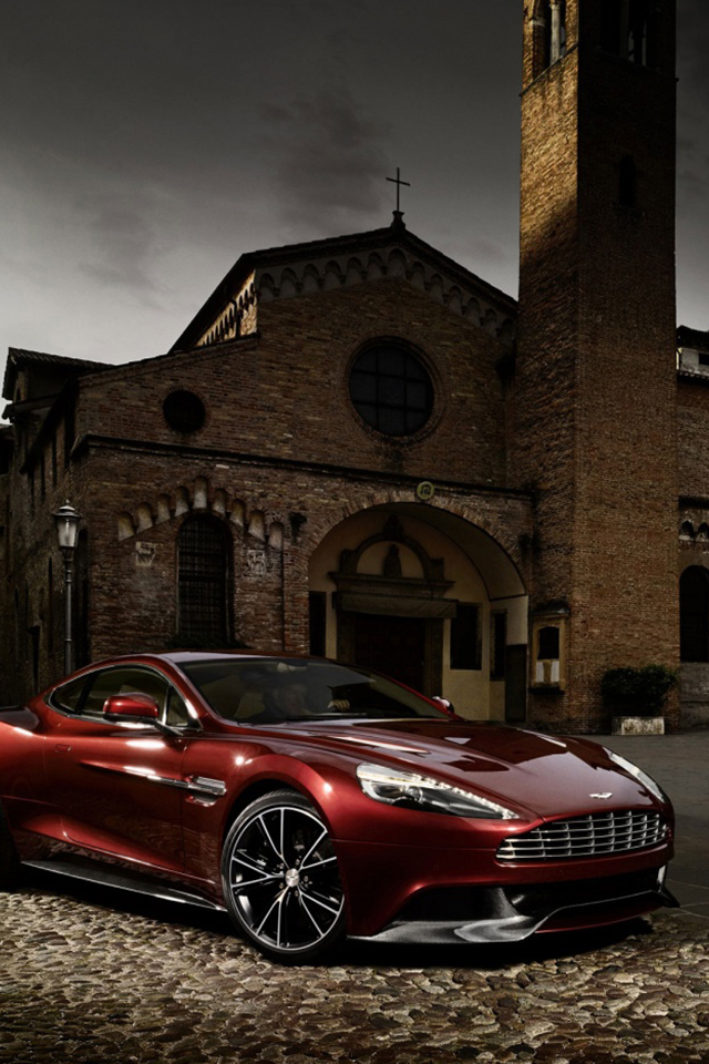 - Рубиновый Aston Martin Vanquish M310 на фоне старинного замка Авто обои для Iphone