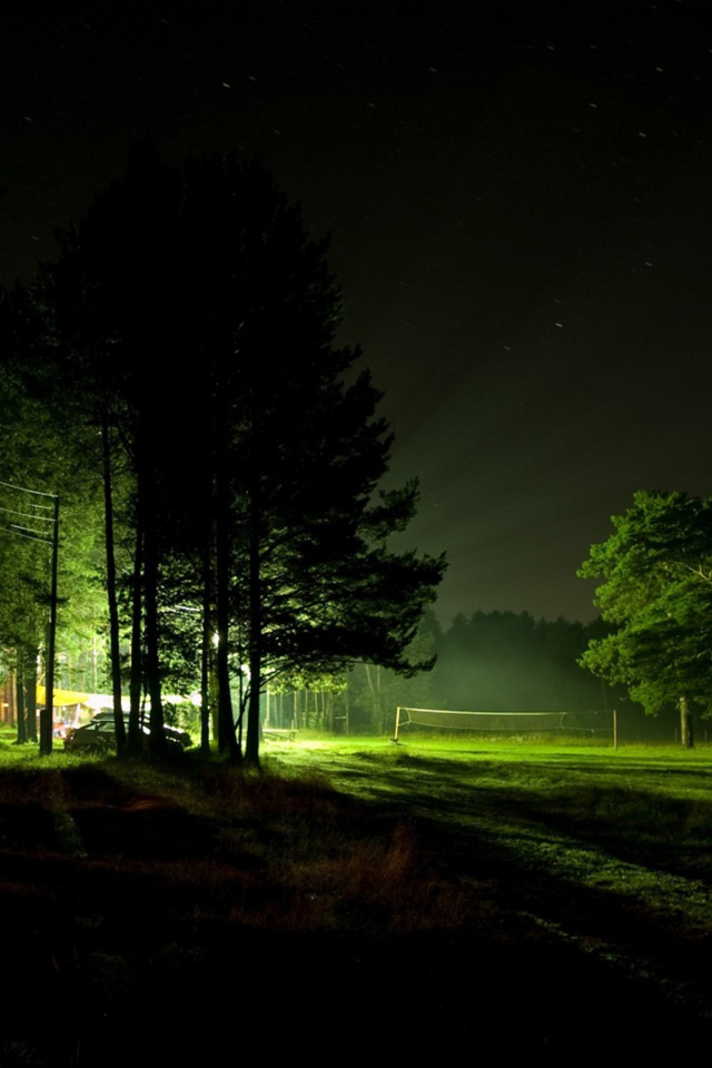 - Яркий свет в ночном лесу проникает сквозь деревья, отбрасывающие тени в пространство ночи. Фото обои для Iphone